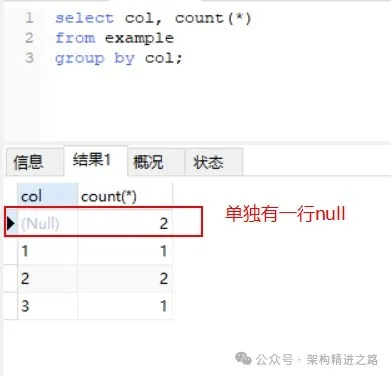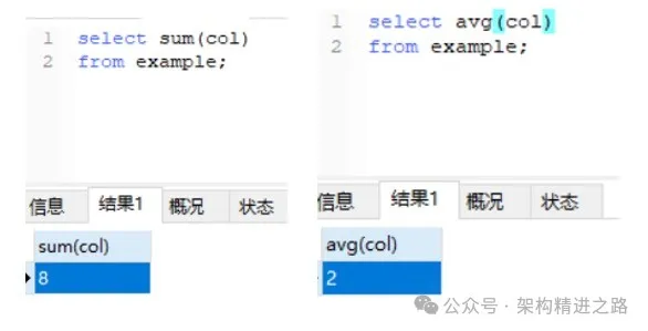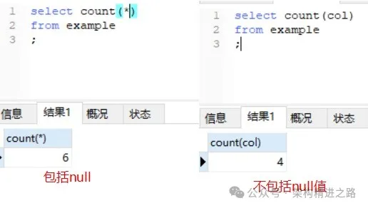 常见的聚合函数有 count、min、max、avg 以及 sum,这些聚合函数在遇到 NULL 值时,处理方式各不相同: