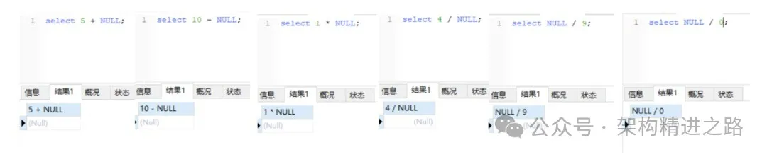当进行加法运算时,如果其中一个值为 NULL,那么结果也为 NULL在进行乘法、除法等其他运算时,只要有一个操作数为 NULL,结果就会是 NULL这种特性使得在处理包含可能为 NULL 值的字段时,需要特别小心,否则很容易得到错误的结果。