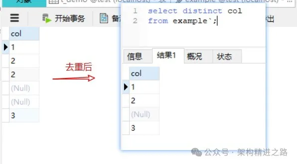 当使用 distinct 对这个字段进行去重操作时,所有的 NULL 值会被视为同一个值,只显示一次。同样,在使用 group by 进行分组操作时,NULL 值的记录会被分到同一组中。