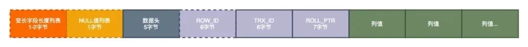InnoDB 的默认行存储格式是 COMPACT,存储格式如下所示,虚线部分代表可能不一定会存在。