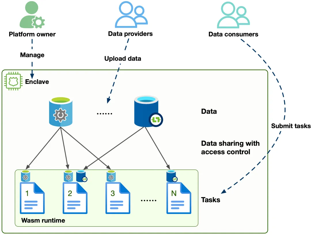 Wasm和TEE的结合实现了飞地内多租户隔离,使得这一搭配非常适合机密计算场景。然而,IT技术网Wasm的线性内存模型缺乏有效的跨模块数据共享和细粒度的内存访问控制,这大大限制了其在机密计算中的应用。在机密计算领域,常见的情况是多个数据用户共享一份机密数据,并且只允许少数特权用户(例如数据所有者)对数据进行修改,例如机密函数即服务(FaaS)平台,机密数据交易市场等场景(如下图所示)。