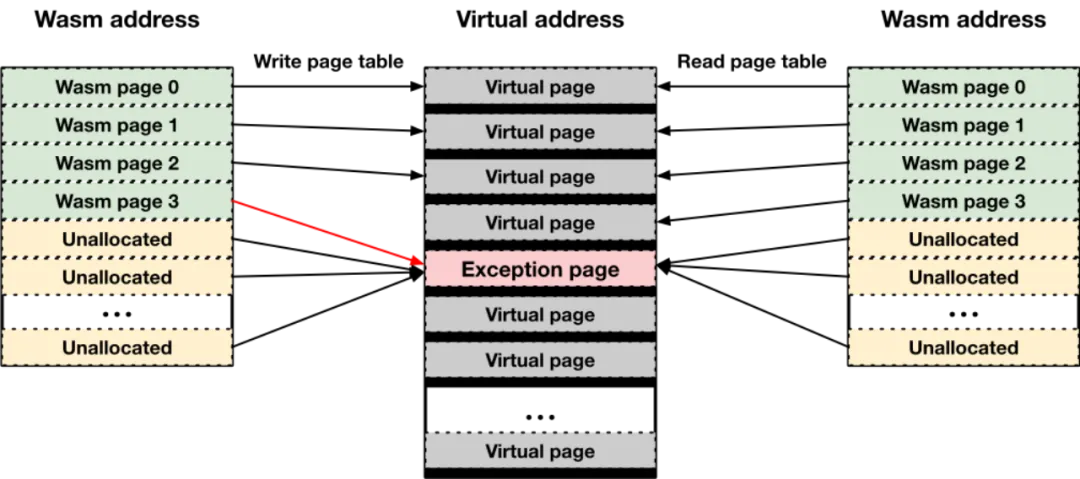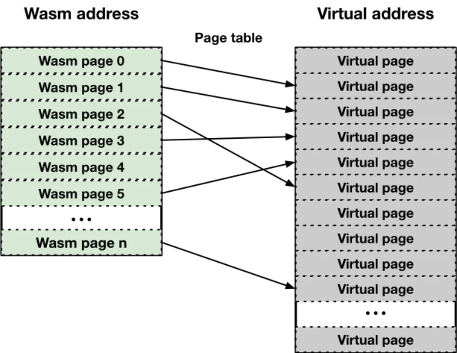 上图展示了前述分页方案,箭头表示从Wasm页到虚拟页的映射(即一个页表项)。注意到,相邻的Wasm页面可以映射到非相邻的虚拟页面。与线性内存模型相比,分页在该地址翻译过程中引入了一个额外的内存读取。