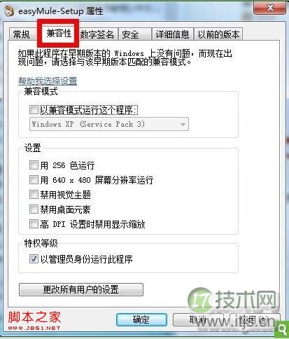 右键你想要设置的程序然后选择“属性”;换到“兼容性”选项卡上,在特权等级栏下勾选“以管理员身份运行此程序”,单击“确定”。