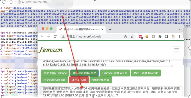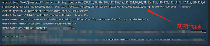 网站源码被插入2个新的meta元素,以及一段JavaScript代码。下图为新增的meta元素,解码后发现是菠菜搜索关键词。