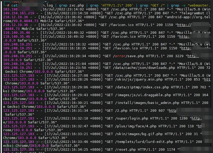 网站日志未被删除,日志显示攻击者在7月17日通过zxc.php上传大量后门文件,下图为日志访问记录截图。