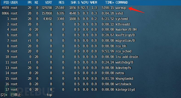服务器上的问题还不仅仅是被挂黑页这么简单。服务器进程排查过程中发现,某进程CPU占用率特别高,不出意外就是挖矿程序了。