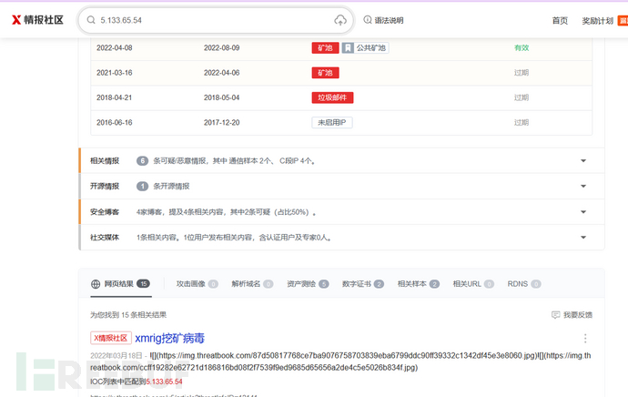 从网络通联信息发现矿池地址为5.133.65.53至5.133.65.56的IP段。威胁情报表明这是一个门罗币矿池。