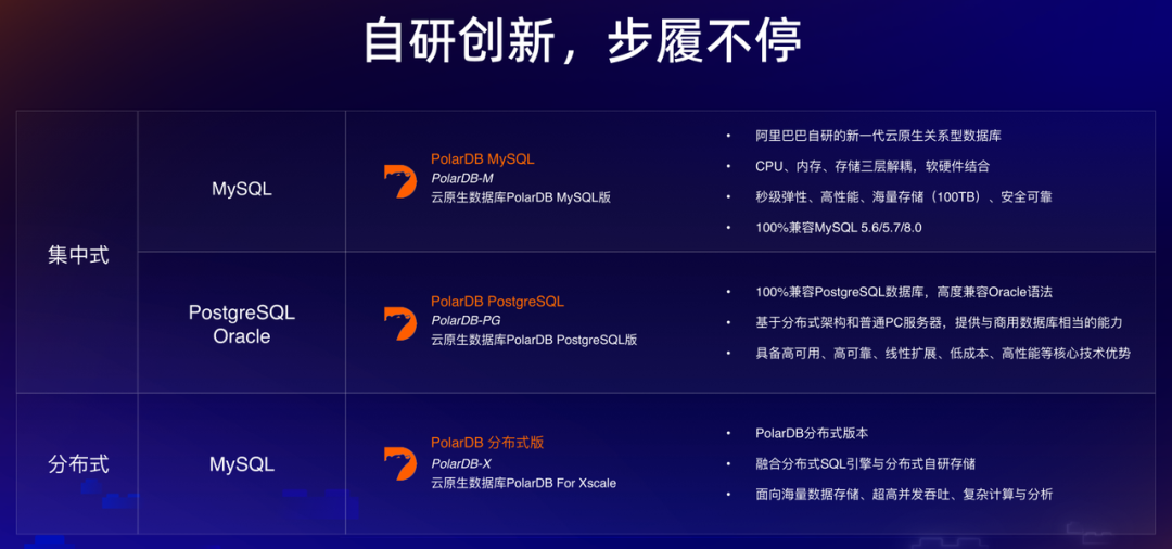 作为一个品牌族,PolarDB 其实是由多款产品组成,主要分为集中式、分布式两个系列;包括有高度兼容 MySQL 的 PolarDB-M、高度兼容 PostgreSQL 和 Oracle 的 PolarDB-PG及分布式版本 PolarDB-X。用户可以根据自身业务场景、生态兼容要求等进行选择。