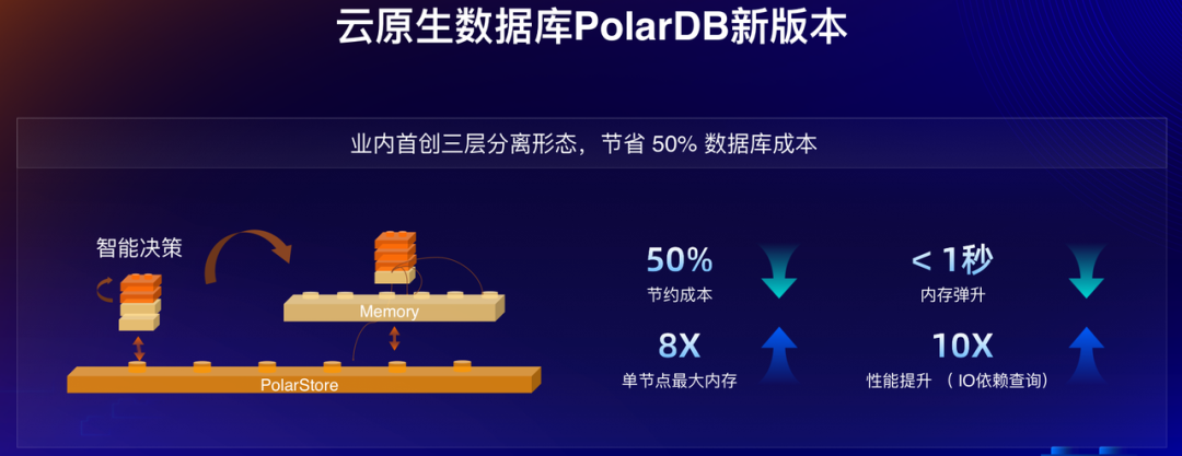 针对云原生化,PolarDB 推出了业内首创的三层分离形态,即对数据库资源层(CPU、MEM、DISK)实现了全部分离,即较以往提供更细粒度的资源管控能力,其带来的优势就是可实现根据不同工作负载搭配不同的资源配置,进而实现最优成本产出比。
