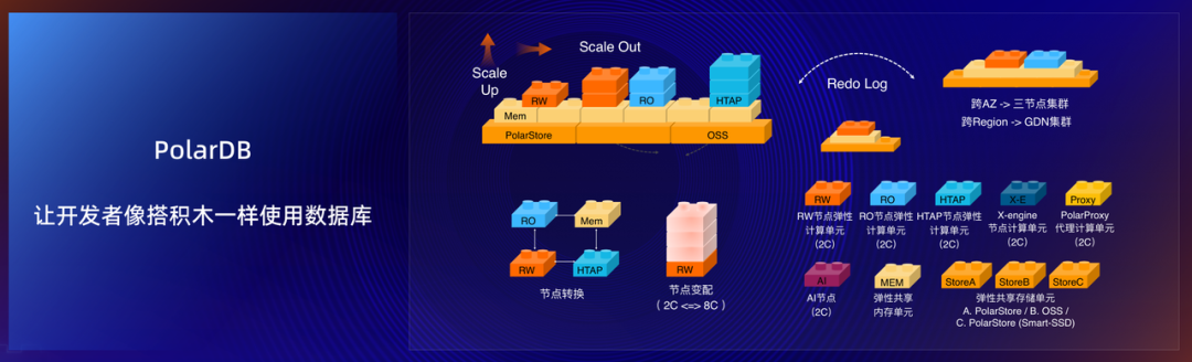 此次发布会的一个重要观点,就是希望向开发者表达 PolarDB 的发展理念,并通过一个比喻-搭积木来形象描述。其通过产品四个方面的加强,来达到这一目标。一是云原生化,即加速数据业务上云,通过一种新的资源交付方式简化开发者使用数据库;二是平台化,即通过云平台的一站式功能帮助开发者使用和管理好数据库;三是一体化,云服务器即通过多场景打通,优化使用体验可实现如“单体”般的使用效果;四是智能化,即通过产品内置 AI 能力,可让数据库一方面变得更加智能简化管理,一方面提供更友好交互的可能。