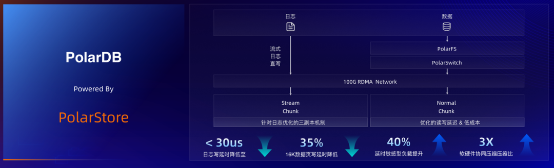 在存储方面,PolarDB 内置的分布式存储系统 PolarStore,通过日志优化、RDMA 高速网络等措施实现低成本下的读写延迟优化。