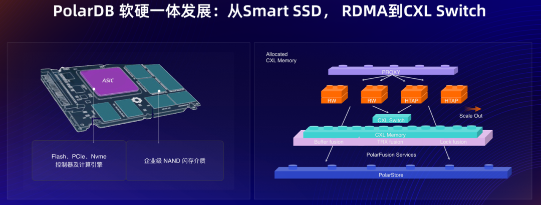 一体化方面,PolarDB 的软硬一体方案,通过在存储、网络、内存等多项硬件领域创新,实现最优费效比。