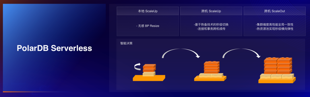 Serverless,作为近年大火的热点,已成为云厂商发力的重点,其对于用户的敏态业务具有非常好的实用价值。PolarDB 通过智能决策系统可实现基于负载感知的向上或向外扩展能力,进而满足用户突发业务压力。结合内核提供的热备、事务重连、全局内存等技术,实现弹性条件下的业务无感。