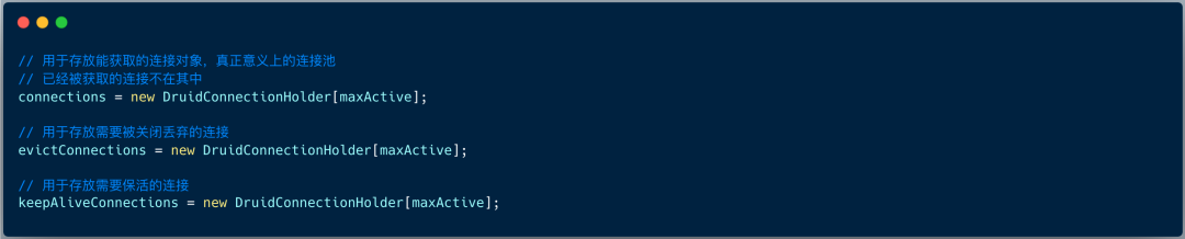 在初始化方法内,数据源创建三个连接池数组 ,他们分别是:
