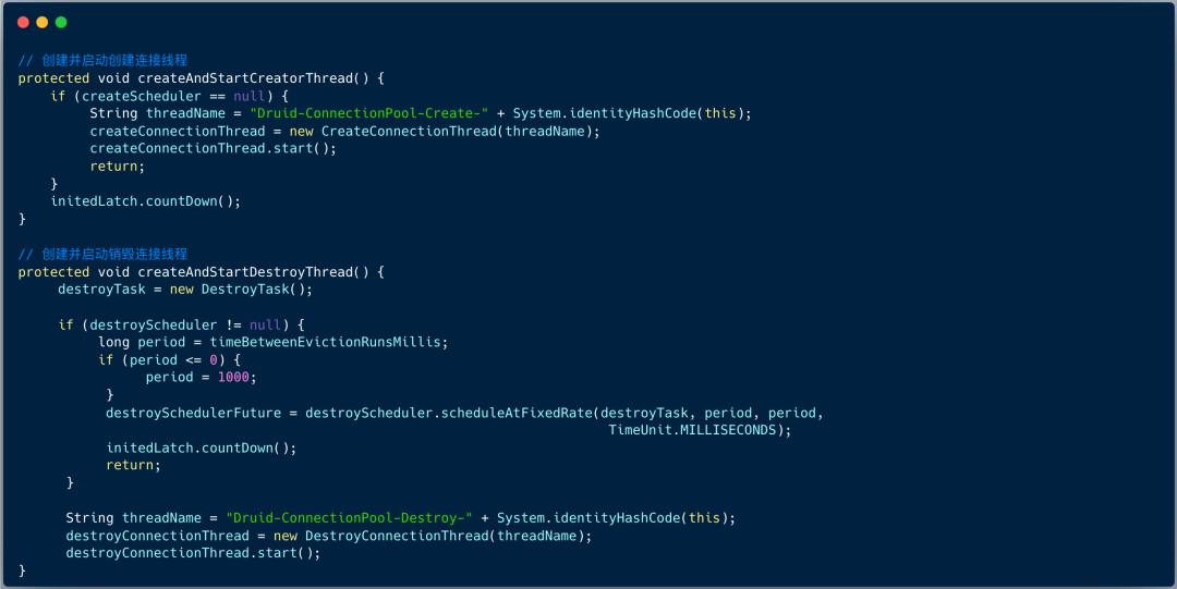 数据源预热之后,启动了两个任务线程:创建连接线程和销毁连接线程。