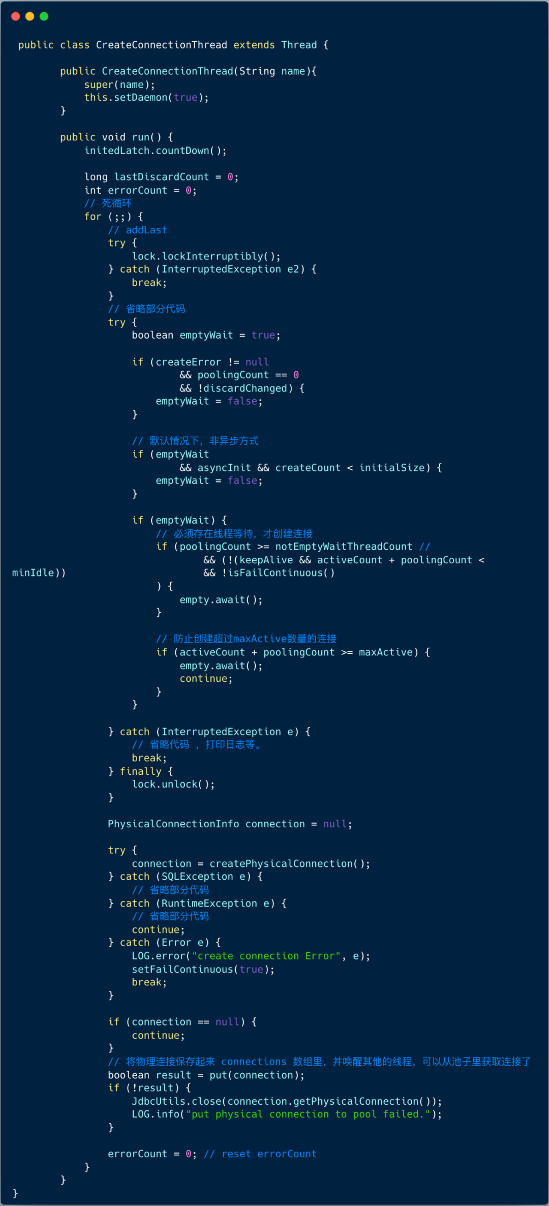CreateConnectionThread 本质是一个单线程在死循环中通过 condition 等待,被其他线程唤醒 ,并实现创建数据库连接逻辑。