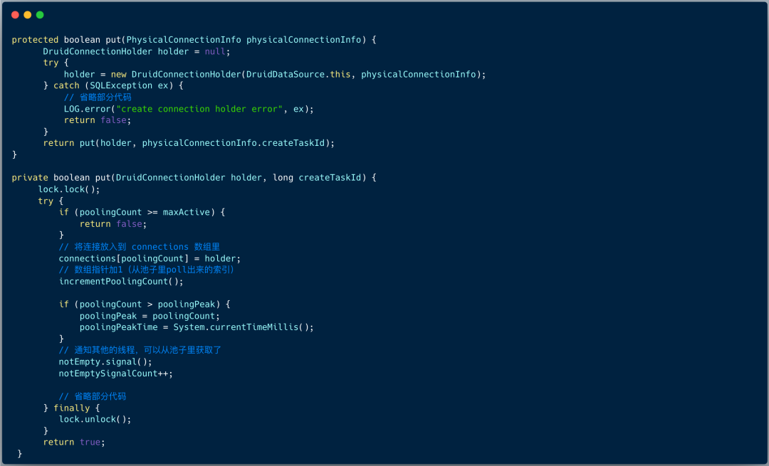 我们可以简单的理解:将连接放到 connections 数组的 poolingCount 位置,并将其自增,然后通过 Condition 对象 notEmpty 唤醒等待获取连接的一个应用程序。