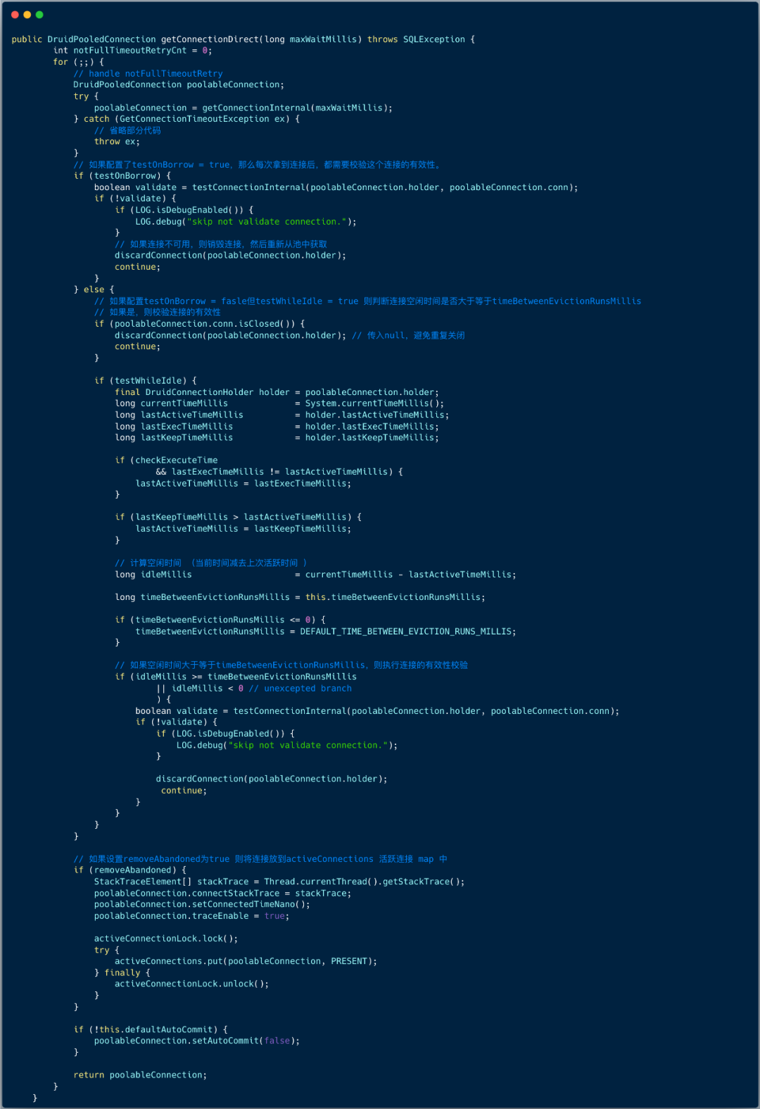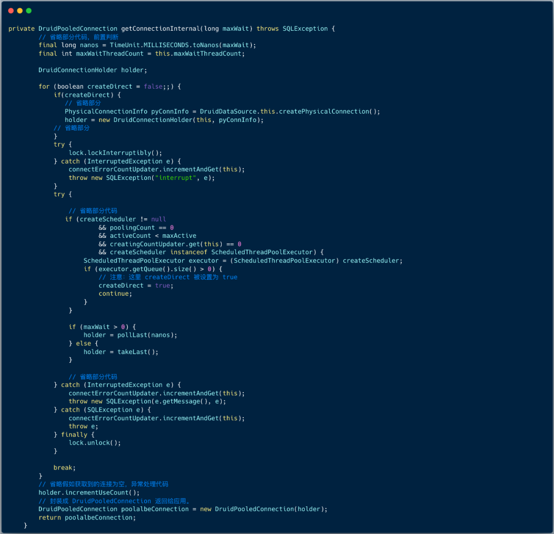 DruidDataSource#getConnection 方法会调用到 DruidDataSource#getConnectionDirect 方法来获取连接,实现如下所示。