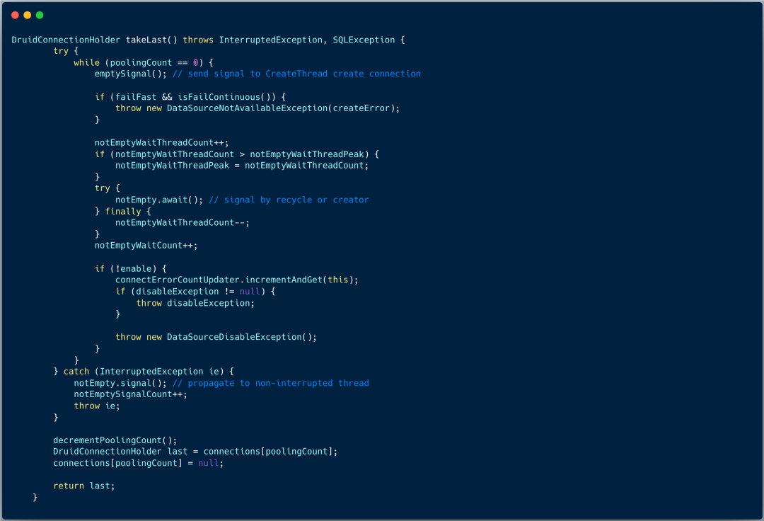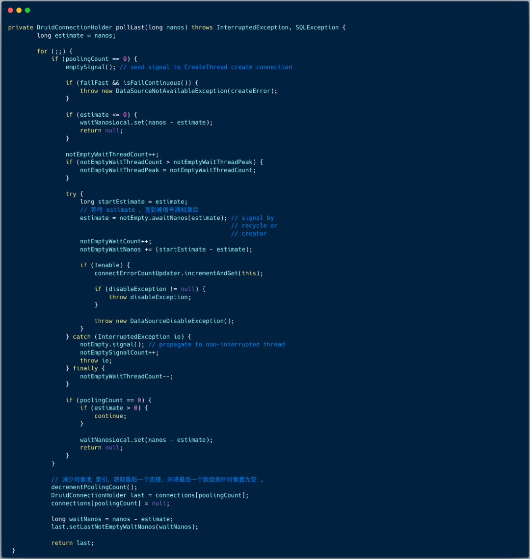 和 pollLast 方法不同,首先方法体内部并没有死循环,通过 Condition 对象 notEmpty 的 await 方法等待,直到池子中有连接,将最后一个连接取出,并将最后一个数组元素置为空。