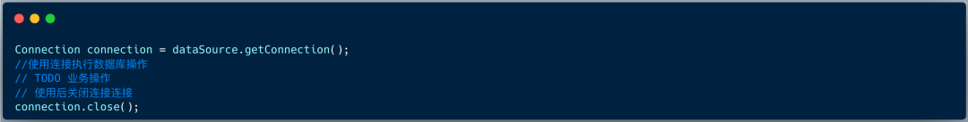 复制Connection connection = dataSource.getConnection(); //使用连接执行数据库操作 // TODO 业务操作 // 使用后关闭连接连接 connection.close();1.2.3.4.5.3)关闭数据源