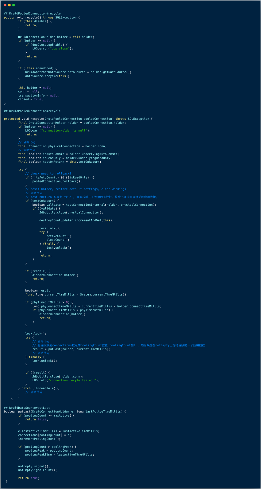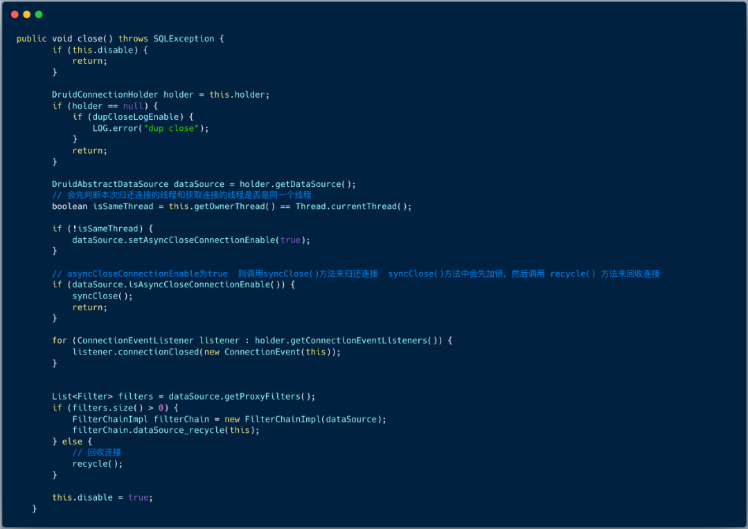 下图展示了 DruidPooledConnection 的 close 方法 :