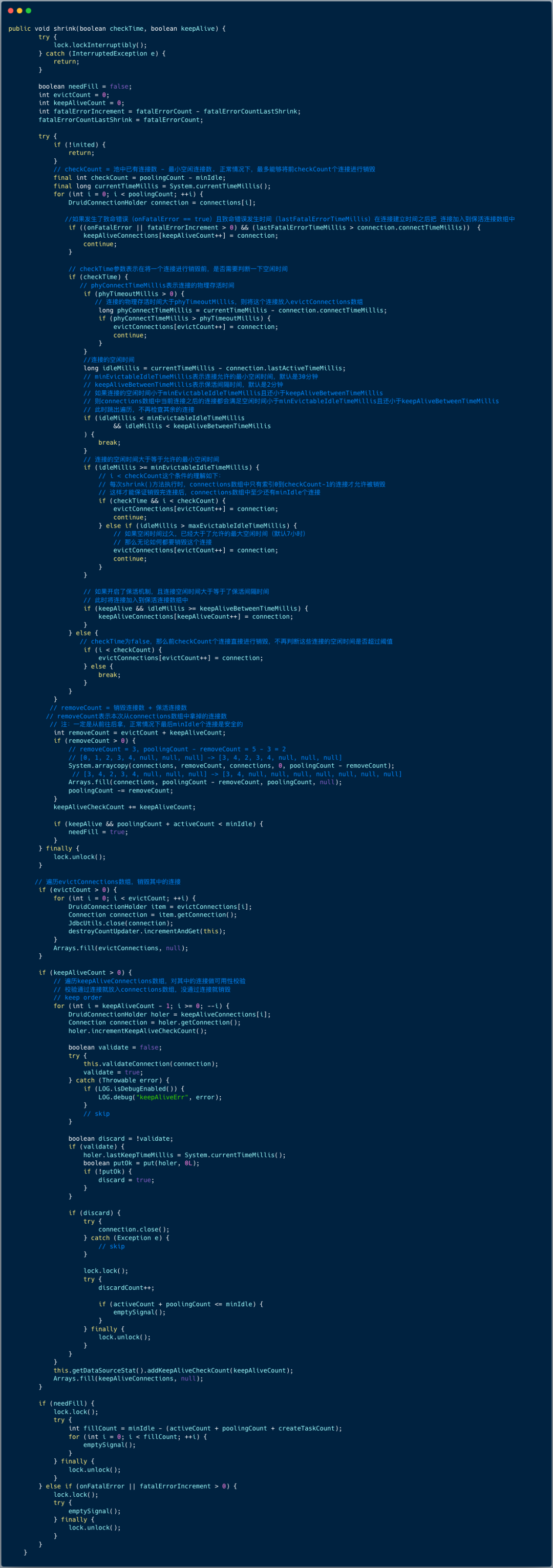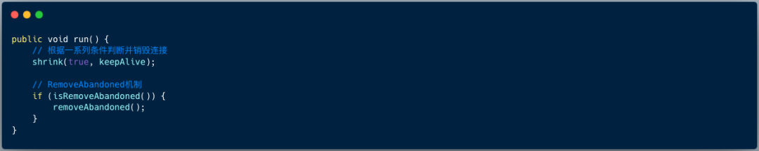 destroyTask的run方法 会调用DruidDataSource#shrink方法来根据设定的条件来判断出需要销毁和保活的连接。