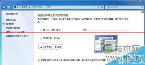 3、设置进入了外观显示设置窗口,图标在窗口中央,和文有3个比例显示的桌字尺单选按钮。选择其中放大比例的125%或150%