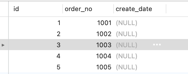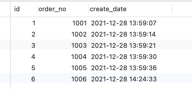 复制CREATE TABLE `t_order` ( `id` int NOT NULL AUTO_INCREMENT, `order_no` int DEFAULT NULL, `create_date` datetime DEFAULT NULL, PRIMARY KEY (`id`), KEY `index_order` (`order_no`)USING BTREE
