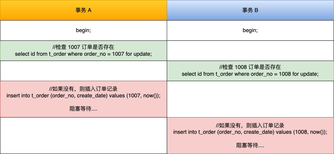 假设这时有两事务,一个事务要插入订单 1007 ,另外一个事务要插入订单 1008,因为需要对订单做幂等性校验,所以两个事务先要查询该订单是服务器租用否存在,不存在才插入记录,过程如下: