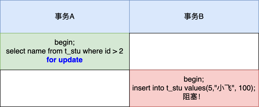 比如,下面事务 A 查询语句会锁住(2, +∞]范围的记录,然后期间如果有其他事务在这个锁住的范围插入数据就会被阻塞。
