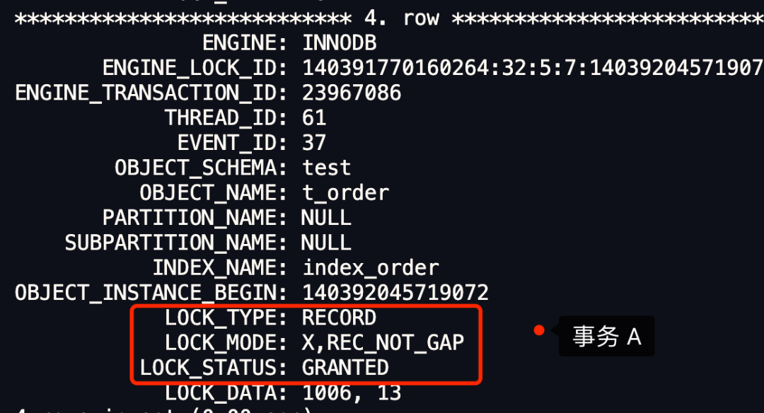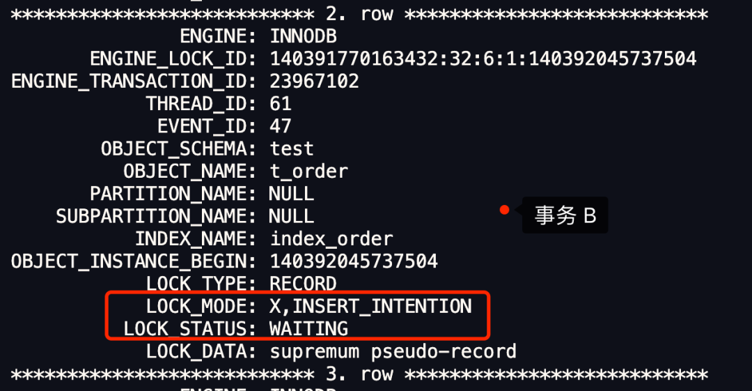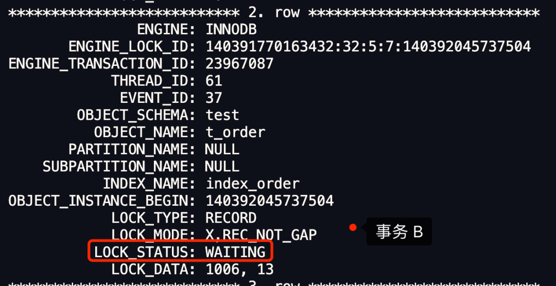 我们也可以从 performance_schema.data_locks 这个表中看到,事务 B 的状态(LOCK_STATUS)是等待状态,加锁的类型 X 型的记录锁(LOCK_MODE: X,REC_NOT_GAP )。