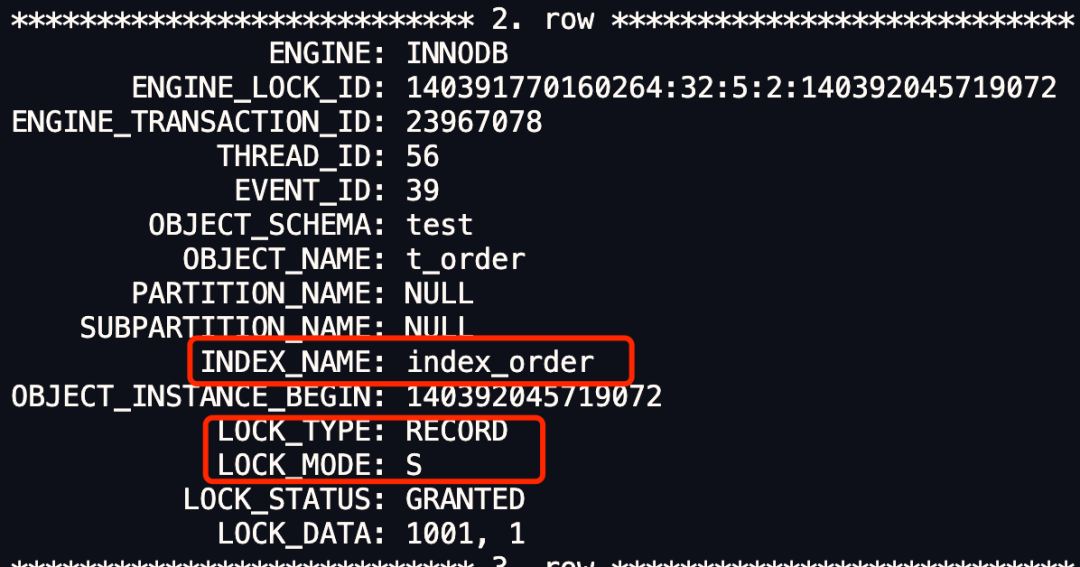 可以看到,index_order 二级索引中的 1001(LOCK_DATA) 记录的锁类型为 S 型的 next-key 锁。注意,这里 LOCK_TYPE 中的 RECORD 表示行级锁,而不是记录锁的意思。如果是记录锁的话,LOCK_MODE 会显示 S, REC_NOT_GAP。