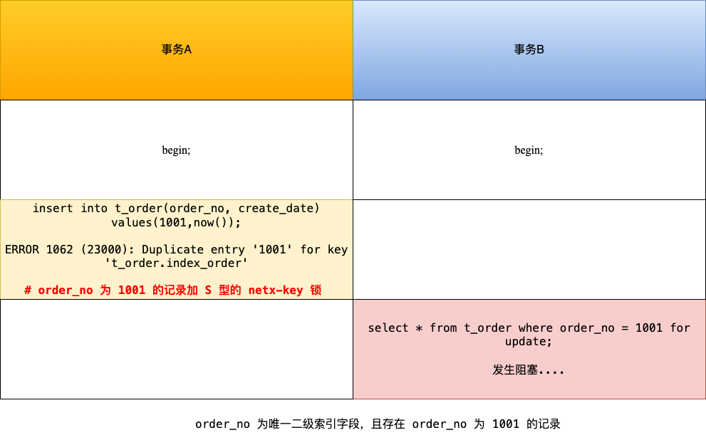 t_order 表中的 order_no 字段为唯一二级索引,并且已经存在 order_no 值为 1001 的记录,此时事务 A,插入了 order_no 为 1001 的记录,就出现了报错。