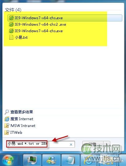 现在,在开始搜索框或是资源管理器右上角的搜索框中输入多个查询关键字试试?例如:小易 and *.txt or IE9。