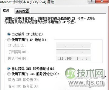 2.在打开的属性窗口中,单击“Internet 协议 (TCP/IP)”,然后再单击“属性”之后,在弹出来的窗口中将这里的所有选项都设置为自动获取,然后点击确定保存设置即可。