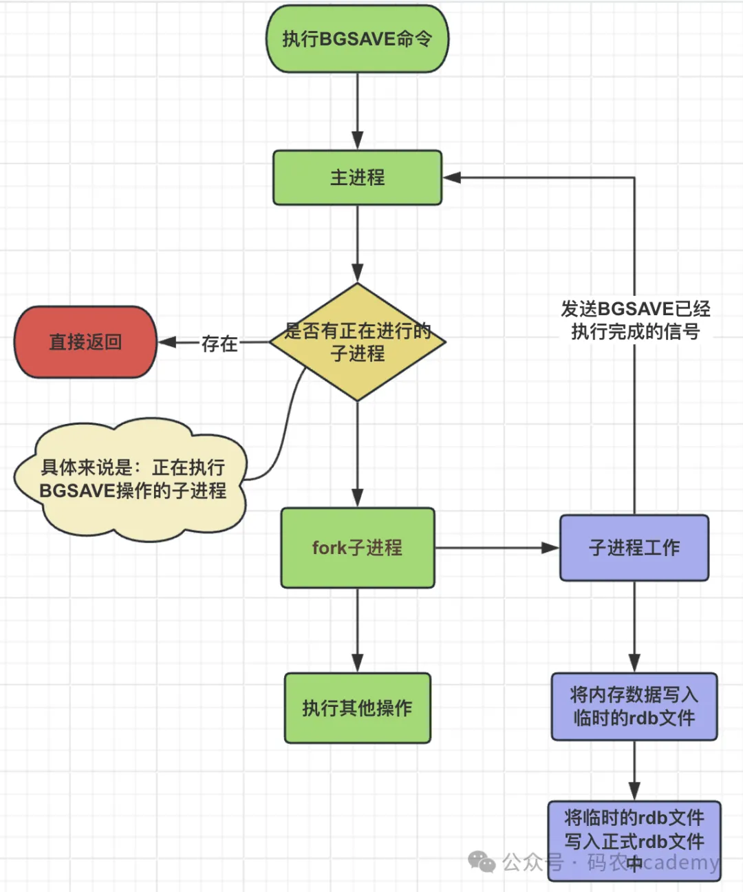 2. Redis主进程检查是否有正在进行的子进程正在执行BGSAVE或AOF rewrite操作。如果存在这种操作,为了避免资源竞争和数据一致性问题,主进程不会再次发起BGSAVE,可能直接返回一个错误或忽略此次请求。