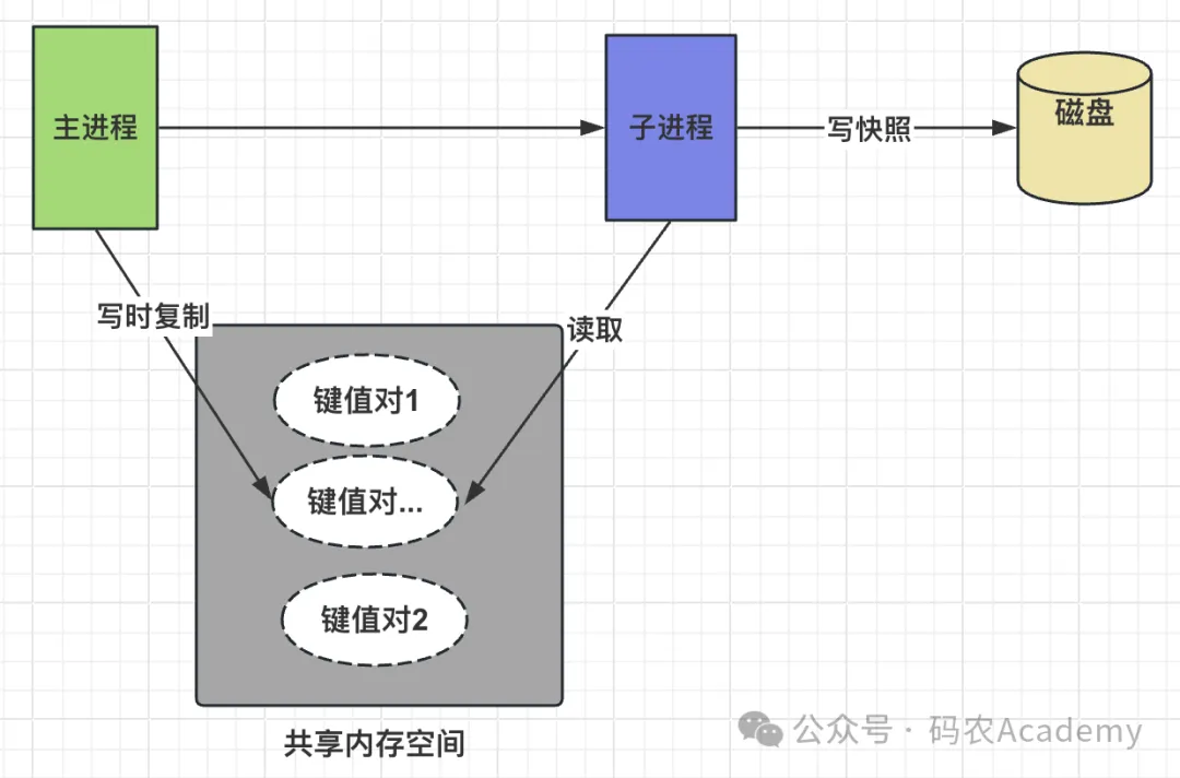 3. 如果没有其他持久化操作正在进行,主进程会执行fork()系统调用来创建一个子进程。fork()调用在执行时会暂时阻塞主进程,直到子进程完全创建。这个过程中,Redis的内存数据不会被复制,而是通过操作系统实现的写时复制(Copy-On-Write, COW)机制共享给子进程。