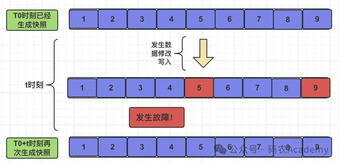 如上图,T0时刻生成了一次快照,那么在t时刻时发生了一次数据修改写入,在写入后到生成下一次快照之前,发生了故障,那么我们恢复数据时,因为T0+t时刻的快照还没生成,数据恢复时只能使用T0时刻的快照,那么在t时刻发生的数据写入就会丢失。所以t时刻的间隔如果变的更小,就会多生成快照,就有很大的几率减少数据丢失的。