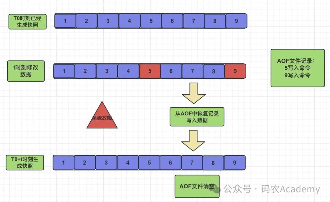 比如,针对RDB快照设置生成间隔的示例,我们使用AOF记录写命令,当某一时刻宕机后,恢复数据时,我们可以从AOF中恢复上一次备份到这次宕机时保存的写操作对应的数据,当数据恢复之后,再使用RDB进行生成快照,然后再清空AOF文件。