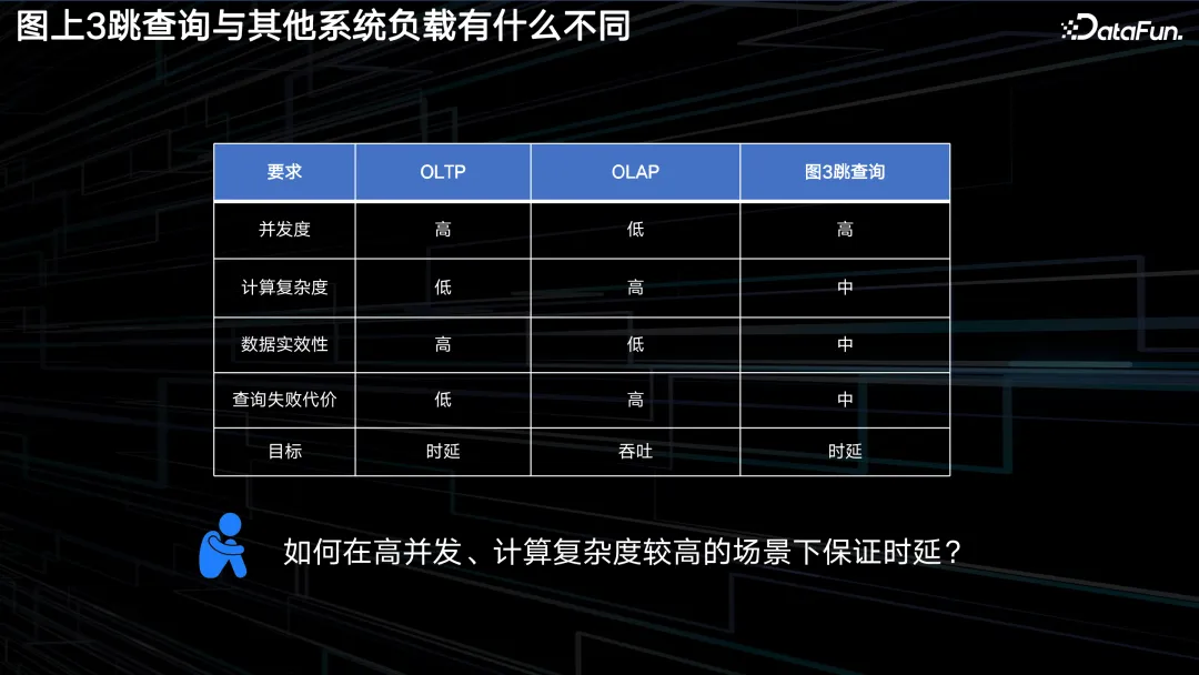 首先在并发方面,OLTP 的并发度很高,而 OLAP 则相对较低。图的三跳查询,服务的仍然是在线场景,其并发度也相对较高,这块更贴近 OLTP 场景。