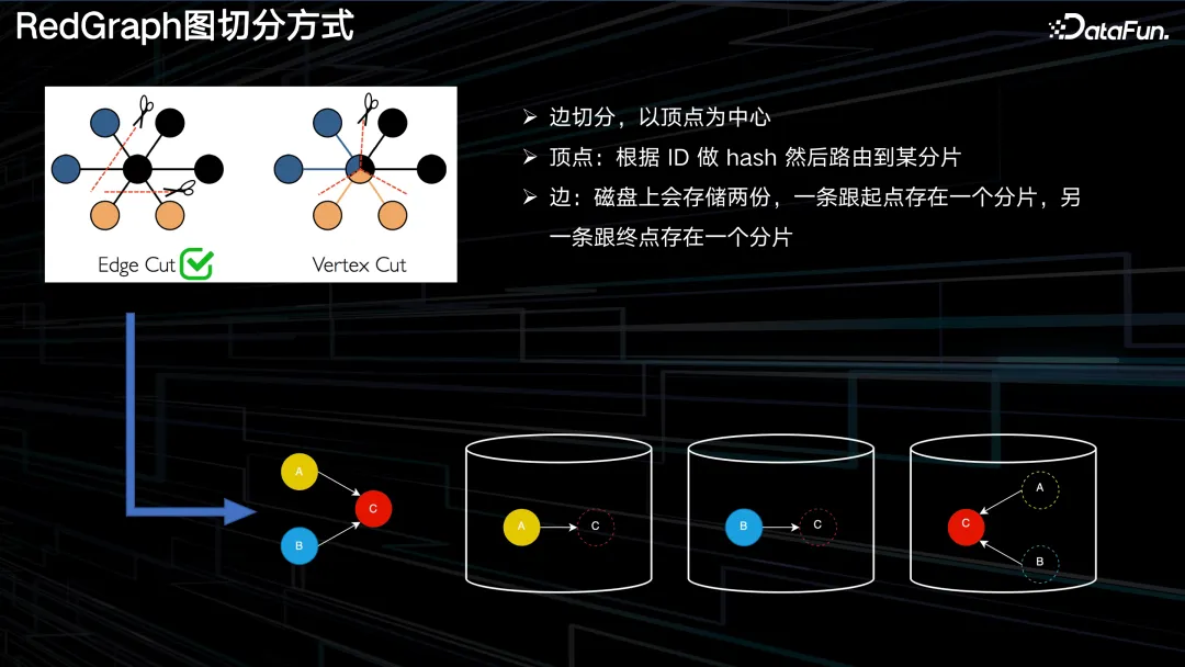 边切分,以顶点为中心,这种切分策略的核心思想是每个顶点会根据其 ID 进行哈希运算,并将其路由到特定的分片上。每个顶点上的每条边在磁盘中都会被存储两份,其中一份与起点位于同一分片,另一份则与终点位于同一分片。如上图中的例子,其中涉及到 ABC 三个顶点的哈希定位结果。在这个例子中,A 至 C 的这条出边,被放置在与 A 同一个节点上。同样,B 至 C 的出边跟 B 放到了一起,最后一个桶中保存了 C 以及 C 的入边,即由 A 和 B 指向 C 的两条入边。