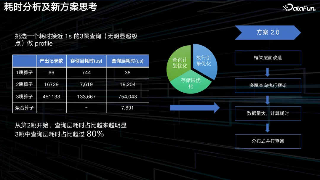 如上图中,是对一个耗时接近一秒的三跳查询的 profile 分析。我们发现在每一跳产出的记录数量上,第一跳至第二跳扩散了 200 多倍,第二跳至第三跳扩散了 20 多倍,表现在结果上,需要计算的数据行数从 66 条直接跃升至 45 万条,产出增长速度令人惊讶。此外,我们发现三跳算子在整个查询过程中占据了较大的比重,其在查询层的耗时更是占据了整个查询的 80% 以上。