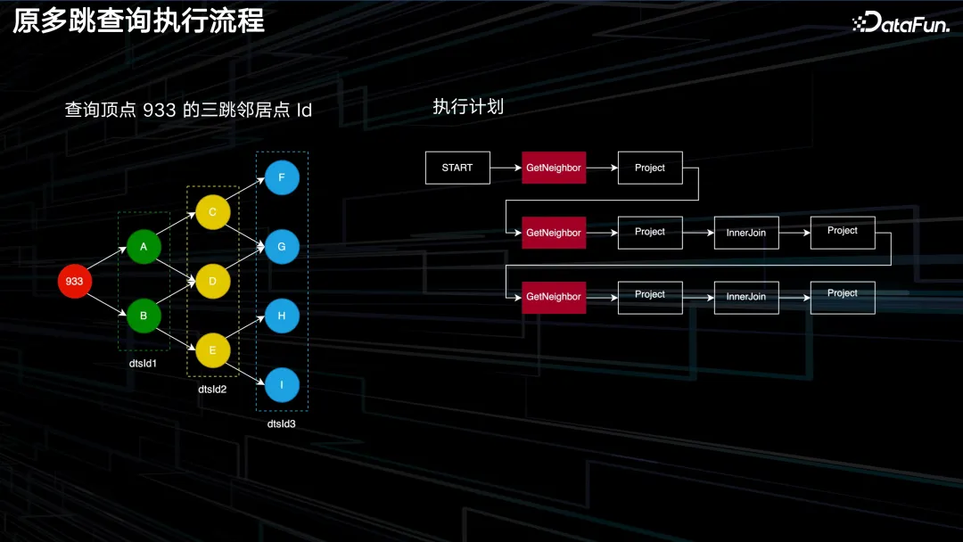 原有的多跳查询执行流程如上图所示。假设我们要查询933 顶点的三跳邻居节点 ID,即检索到蓝圈中的所有顶点。经过查询层处理后,将生成右图所示执行计划,START 表示计划的起点,本身并无实际操作。GetNeighbor 算子则负责实际查询顶点的邻居,例如根据 933 找到 A 和 B。后续的 Project、InnerJoin 以及 Project 等操作均为对先前产生的结果进行数据结构的转换、处理及裁剪等操作,以确保整个计算流程的顺利进行。正是后续的这几个算子耗费的时延较高。