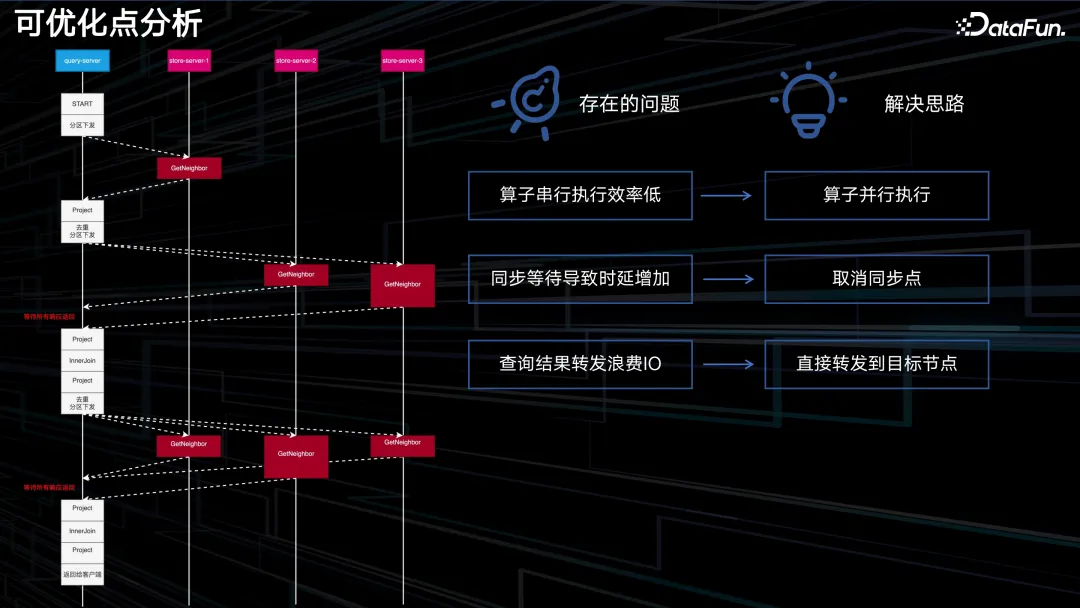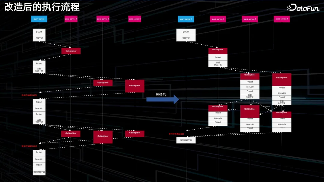 在整个流程中,我们明显观察到三个问题。首先,图中蓝色方框内的算子都是串行运行的,必须等待前一个计算完成后,才能执行下一个。对于大规模的数据,串行执行的效率显然无法与并行执行相提并论。其次,Query Server 内部存在一个同步点,即左侧标注为红色的字(等待所有响应返回),要求 query Server 等待所有存储节点的响应返回后,才能继续执行后续操作。若某一存储节点的数据量较大或负载过高,导致响应速度较慢,则会耗费大量时间在等待上,因此我们考虑取消同步等待的过程。最后,存储层的结果需要先转发回查询层进行简单处理,然后再向下发送,这无疑增加了不必要的转发成本。如果存储节点(Store Server)能够自行转发,便可避免一次网络转发过程,从而降低开销。