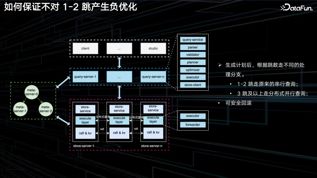 首先一个问题是,在进行改造时如何确保不会对原始的 1-2 跳产生负优化。在企业内部进行新的改造和优化时,必须谨慎评估所采取的措施是否会对原有方案产生负优化。我们不希望新方案还未能带来收益,反而破坏了原有的系统。因此,架构总体上与原来保持一致。在 Store Server 内部插入了一层,称为执行层,该层具有网络互联功能,主要用于分布式查询的转发。Query Server 层则基本保持不变。