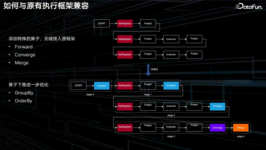 第二个关键问题是如何维持与原有执行框架的兼容性,即在进行分布式技术改造时,不希望对原有代码进行大幅修改,而希望通过最小化的调整达到目的。这里参考了其他产品的一些思路,具体来说,就是在一些需要切换分区访问的算子(如 GetNeighbor 等)之前,添加具有路由功能的算子。这里有三种,分别为 Forward、Converge 和 Merge。Forward 的作用显而易见,即当遇到任何运算符时,表示数据需要转发给其他节点处理,而当前节点无法继续处理。Converge 运算符则是在整个执行计划的最后一步添加,用于指示最终结果应返回至最初接收用户请求的节点。在 Converge 后,还需添加一个 Merge 运算符,该节点在收到结果后需要进行聚合操作,然后才能将结果返回给客户端。如此修改后,我们只需实现这三个算子本身,无需对其他算子进行任何修改,且不会对网络层造成干扰,实现了极轻量级的改造。在执行计划修改的过程中,我们还进行了一些额外的优化,例如将 GroupBy、OrderBy 等算子也进行了下推处理。
