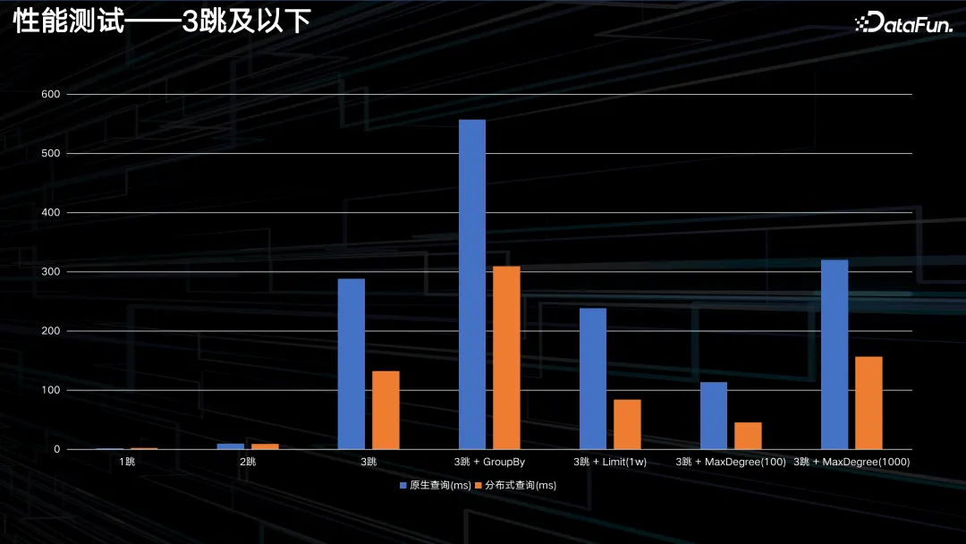 根据评估结果显示,在一跳和二跳情况下,原生查询和分布式查询性能基本相当,未出现负优化现象。从三跳起,分布式查询相较于原生查询能实现 50% 至 60% 的性能提升。例如,在 Max degree 场景下的分布式查询已将时延控制在 50 毫秒以内。在带有 Max degree 或 Limit 值的情况下,时延均在 200 毫秒以下。尽管数据集与实际业务数据集存在差异,但它们皆属于社交网络领域,因此仍具有一定的参考价值。