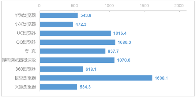 (1)9 款 App 在用户完成一次网站浏览活动(启动 App、搜索信息、打开网站)时,上传数据流量平均⁽⁴⁾最多的为悟空浏览器,约为 1608KB;平均最少的为小米浏览器,约为 472KB。具体情况如图 1。