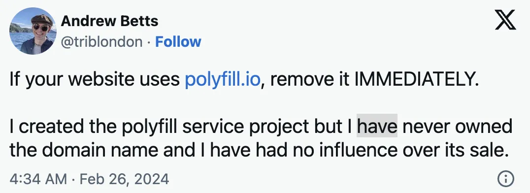 其实早在今年 2 月,Polyfill.js 的作者就表示,如果网站使用 polyfill.io,请尽快删除,现代浏览器已经不再需要它。并且作者已经不再拥有它,无法保证后续的正常使用。
